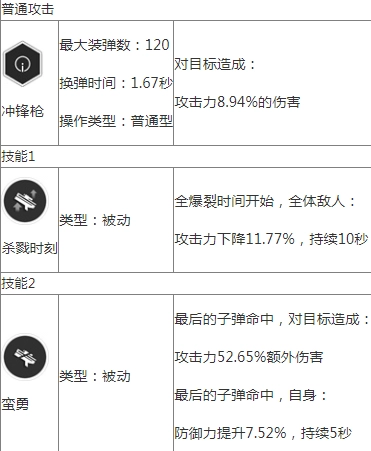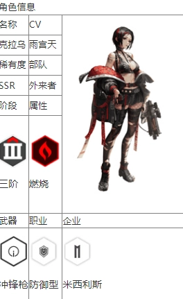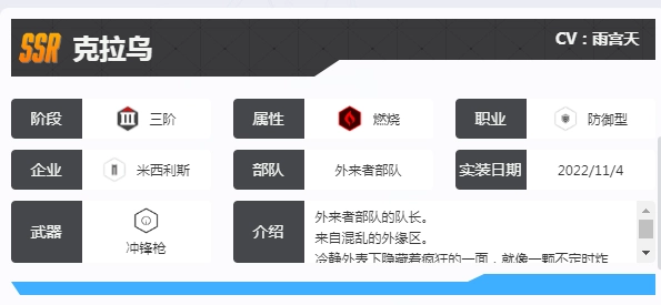 克拉乌属于SSR品质,定位为防御型。其手上的冲锋枪是关键要点,整体优势较为显著。在战斗中,克拉乌的实力不容小觑,每次攻击能造成约8.94%攻击力的伤害。