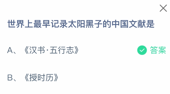 你知道世界上最早记录太阳黑子的中国文献是什么吗?这可是4月19日支付宝蚂蚁庄园小鸡答题的题目哦。支付宝的小鸡答题活动深受大家喜爱,通过参与答题获取饲料,就能喂养小鸡,小鸡下更多的蛋,进而帮助到更多人。今天这道题的正确答案是【《汉书·五行志》】。在《汉书·五行志》里记载着,西汉“河平元年(公元前28年)……三月已未,日出黄,有黑气大如钱,居日中央。”这段内容详细地描述了黑子出现的时间和位置,这也是现今世界上公认的最早的太阳黑子记录。