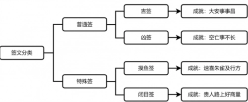 占卜所能获取的签文分为以下类别,总计11种签文,其中吉签有6种,凶签有3种,另外还有1种摸鱼签与1种闭目签。