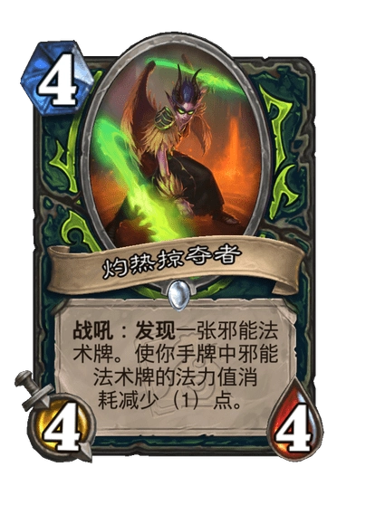 效果:战吼:发现一张邪能法术牌,并使你手牌里的邪能法术牌法力值消耗降低(1)点。