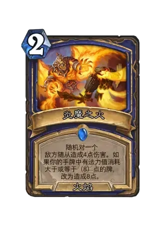 效果:随机对一名敌方随从造成4点伤害。若你手牌里存在法力值消耗大于等于8点的牌,则改为造成8点伤害。