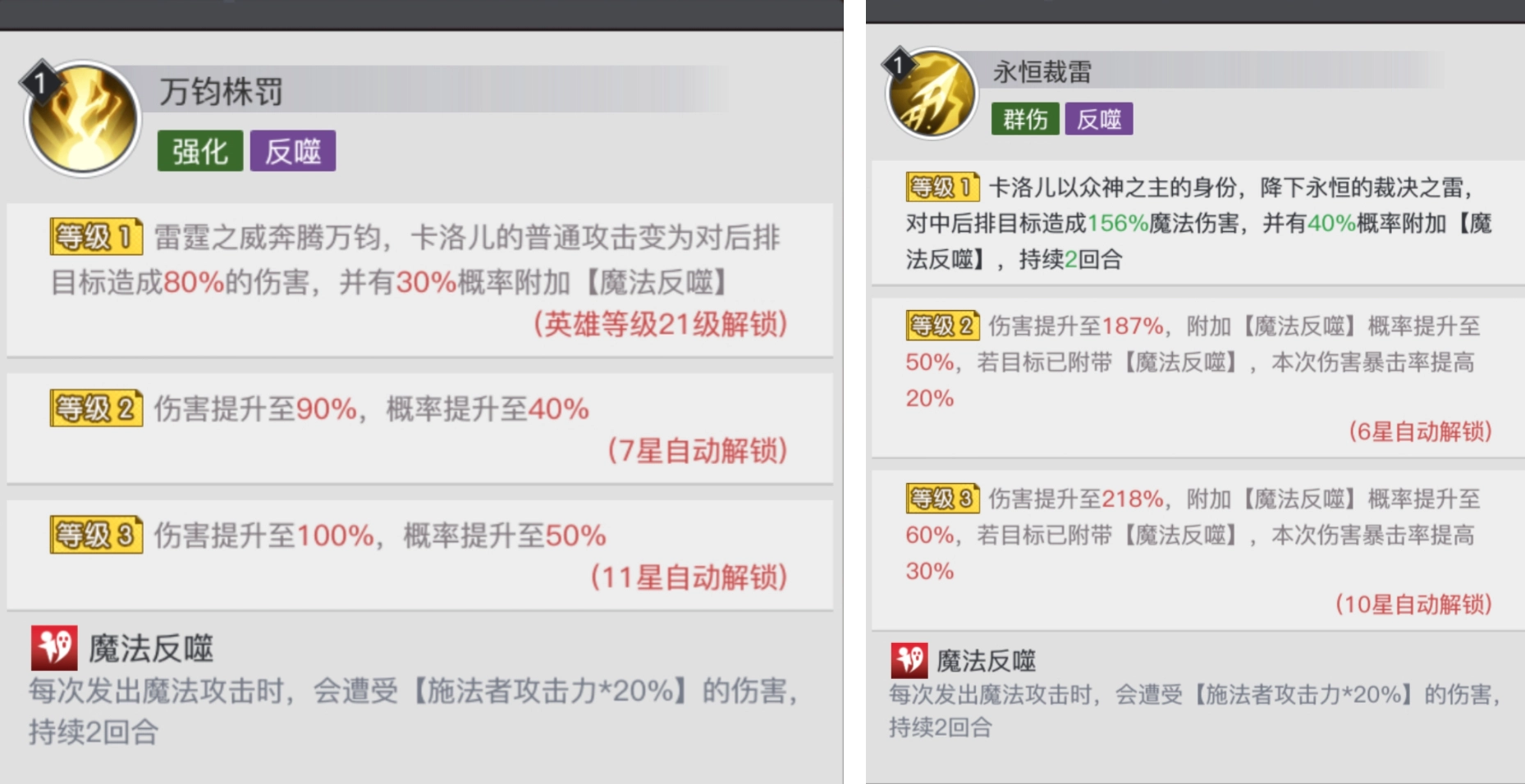 卡洛儿作为极其强力的传说英雄,其普通技能【万钧株罚】和怒气技【永恒裁雷】,均能对敌方中后排造成群体伤害,且有一定几率给目标附加【魔法反噬】效果。一旦敌方处于此效果下,发动魔法攻击时就会遭到一定程度的伤害反噬。而当卡洛儿配合怒气技被动,对处于【魔法反噬】状态的敌人发起攻击时,还可提升本次伤害的暴击率。如此高额的伤害,能够极为有效地削弱敌方状态。