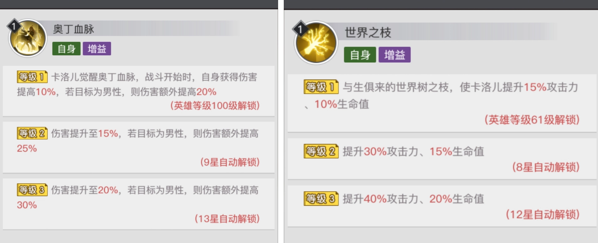 此外,卡洛儿的【奥丁血脉】与【世界之枝】技能,为她带来了大幅度的数值加成。其中,【奥丁血脉】在针对特定目标时,甚至能额外将攻击提升最高达30% 。实战里,卡洛儿凭借这两个技能,能够打出极为惊人的伤害,堪称传说英雄中极为稀有的强力战神。
