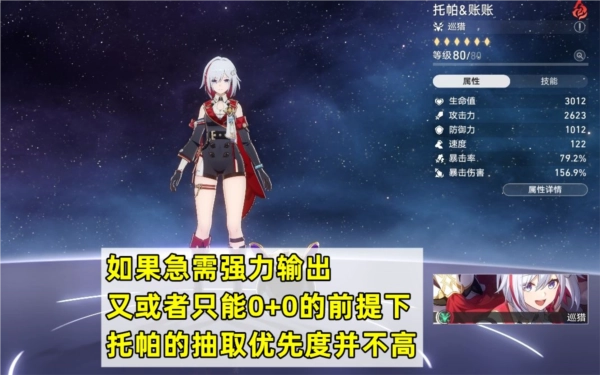 从实战表现出发,要是处于急需强大输出的情况,或者只能是“0+0”(零命座零专武)的条件下,托帕的抽取优先度并非很高。若想让托帕完全展现出自身实力,起码还得有一位能高频主动引发追击,且追击伤害不低的队友。