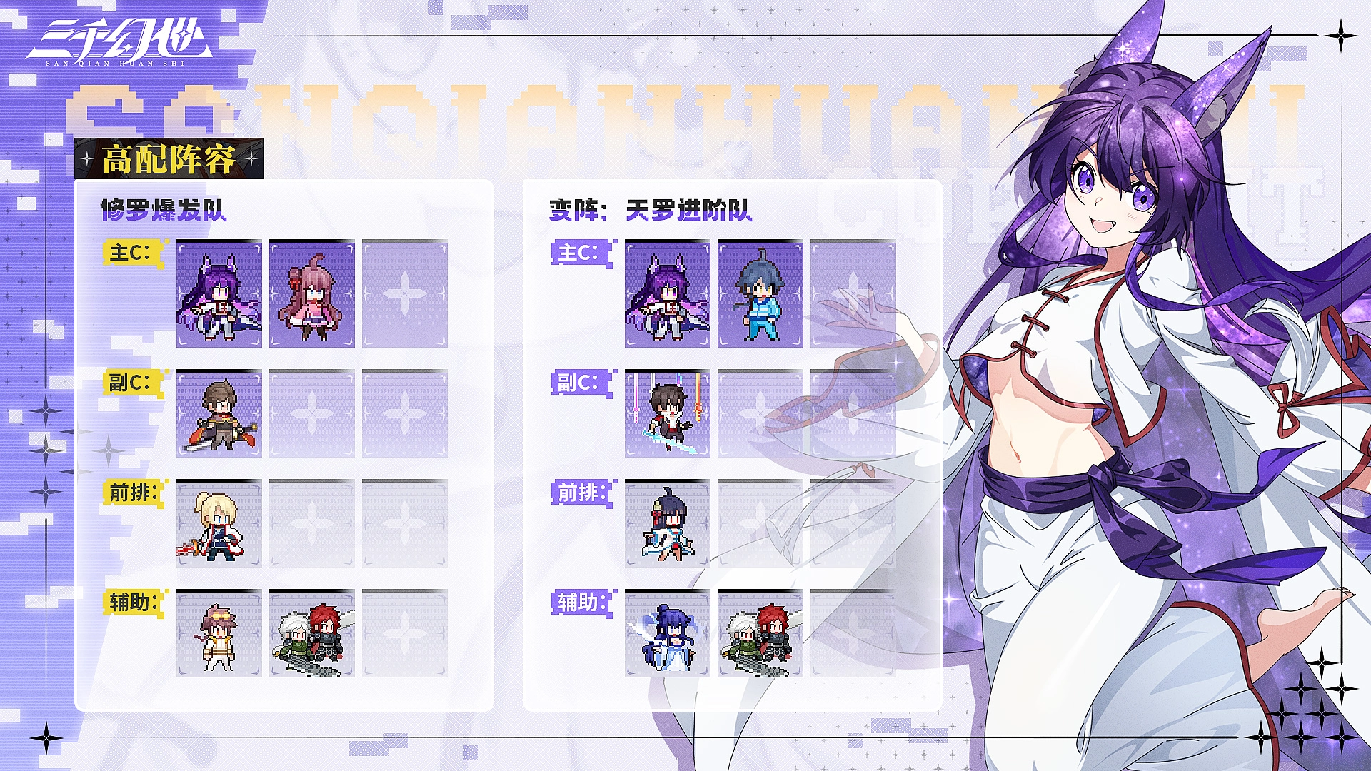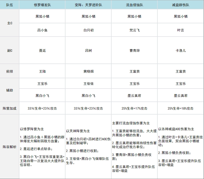 三千幻世中的黑狐·小牺,具备强大的收割能力,还能施加debuff,对敌方后排构成巨大威胁。不仅如此,面对拥有护盾或高生命值的单位,黑狐·小牺同样能妥善应对,是极其值得抽取与培养的主c英雄。接下来为你推荐基于黑狐·小牺英雄特性的阵容,仅供参考。