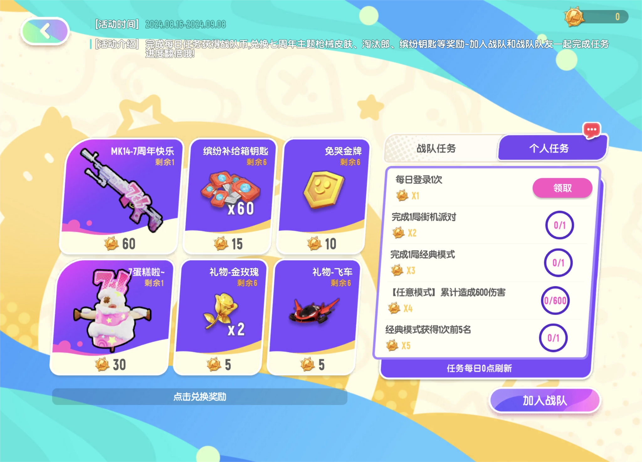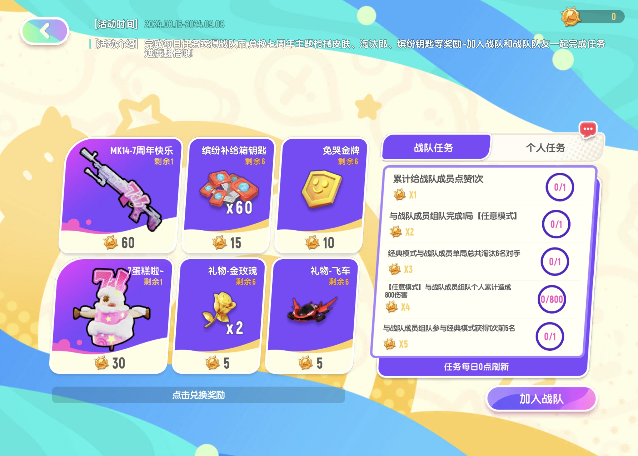 要是肠肠加入了战队,便能解锁战队任务!和战队成员一同游玩并完成任务,就可获取更多战队币!战队任务每天0点刷新,快邀请战队成员组队去赢取更多战队币吧~