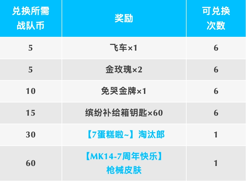 在此次活动里,肠肠能够获取飞车×6、金玫瑰×12、免哭金牌×6、缤纷补给箱钥匙×360,以及【7蛋糕啦~】淘汰郎、【MK14 - 7周年快乐】枪械皮肤。