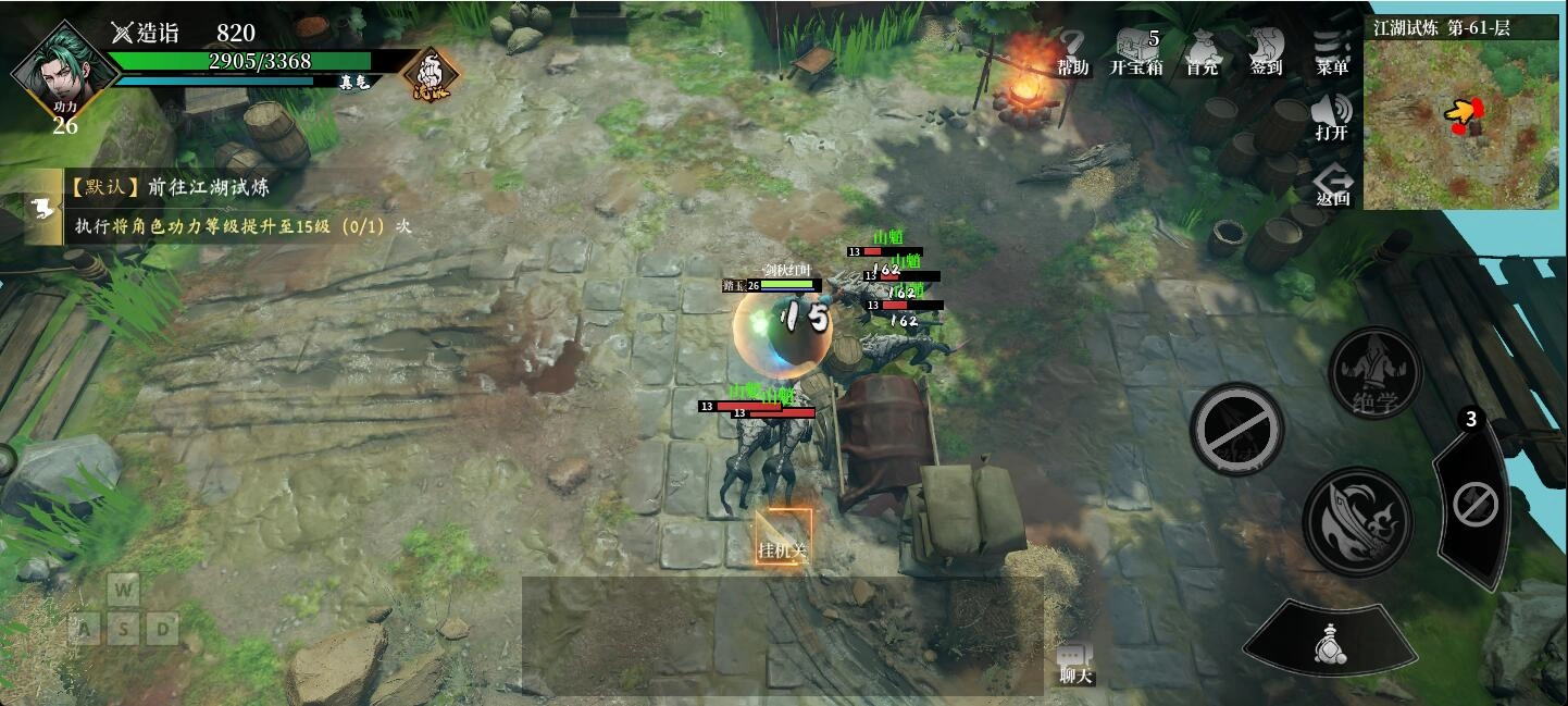 1、对于每一位新手玩家而言,江湖试炼是踏入游戏世界后的必经阶段。当玩家初次进入游戏,便会接到新手任务,这些任务将引导玩家进入江湖试炼,从而实现角色升级。在江湖试炼模式中,玩家还能选择挂机。只需点击挂机按钮,就能轻松开启挂机模式。