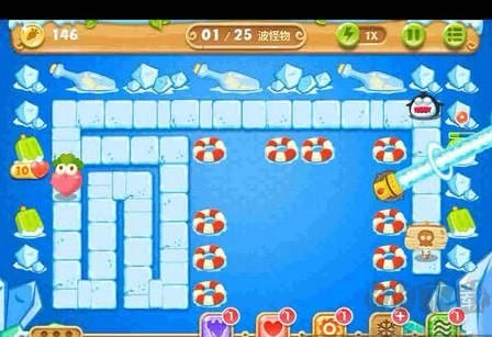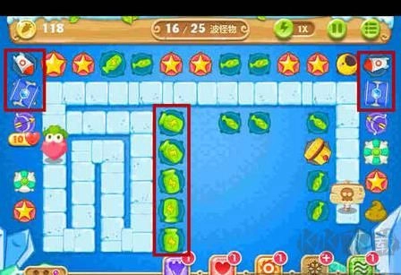 2、选择要升级的炮塔至关重要。在游戏前期,玩家需升级火箭炮与冰锥塔,以此确保小怪无法靠近萝卜,同时也为清除屏幕道具提供保障。此外,还需对中间的瓶子炮进行升级,这样才能具备足够火力消灭怪物。
