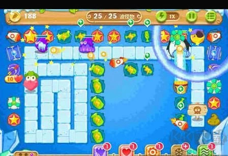 3、接下来便是等待怪物现身,随后持续升级炮塔,强化火力。要是感觉萝卜数量不足,可酌情卖掉中间的部分炮塔,毕竟顶级炮塔的威力比两个普通炮塔还要大。