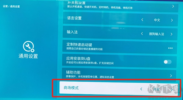 2、待安装包下载完成后,从电脑上拔下U盘,然后把U盘插入电视的USB接口。接着打开电视,依次找到“我的应用”—“设置”—“通用设置”,并开启商场模式。 注意:通常情况下,电视的USB接口位于电视背面,而盒子的USB接口在盒子侧面。