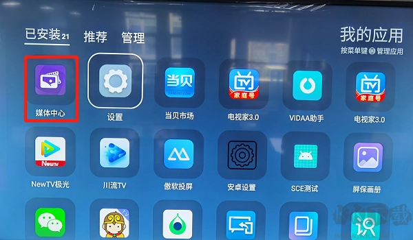 3、开启商场模式后,进入“我的应用”,找到“媒体中心”,从中找出安装包,接着点击安装该安装包,安装完成后即可观看。