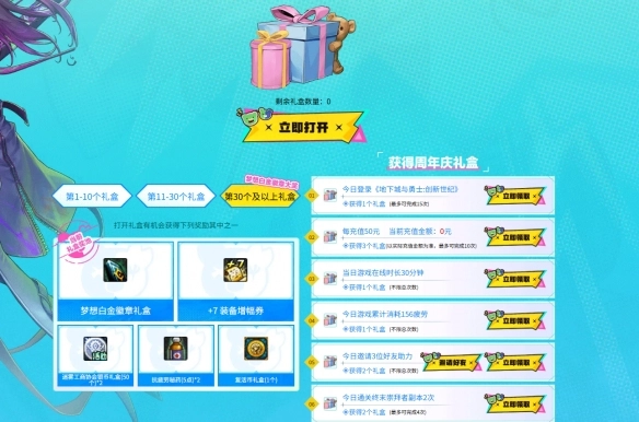 3、在界面完成指定任务,即可获得【周年庆狂欢礼盒】,开启礼盒可获取各类不同奖励。