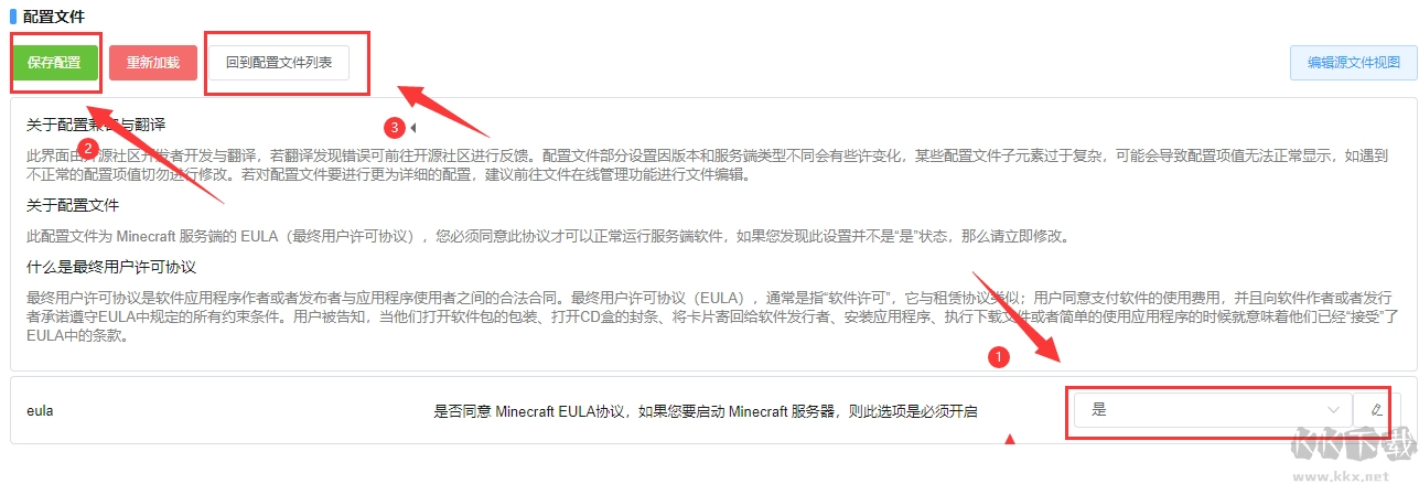 5、我们需要点击特定配置,[通用] eula.txt ,勾选是,