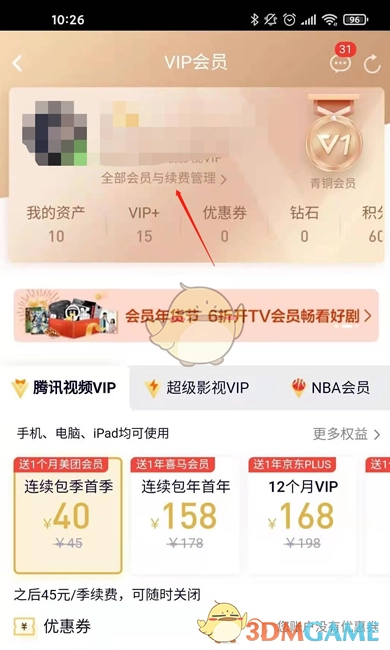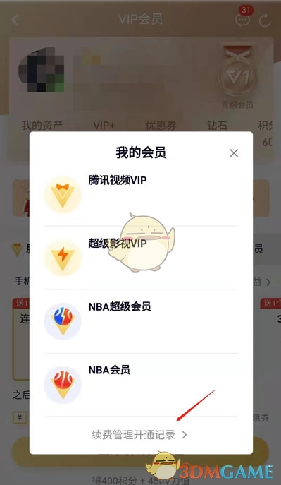 1. 进入腾讯视频“个人中心”界面,点击视频VIP,接着选取【全部会员与续费管理】。