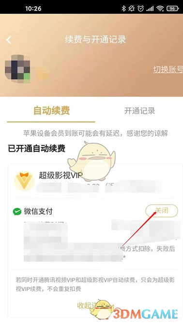 3、寻找到自动续费的设置路径,点击关闭按钮就可以了。