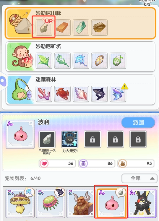 不同宠物拥有不同的派遣的技能,也就是说不同的宠物可以获得不同的材料,