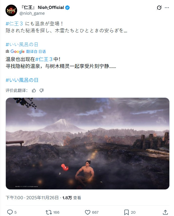 另外,《仁王》官方推特也已确认温泉会在《仁王3》里登场,玩家能够探寻隐秘的温泉,享受片刻的宁静时光。