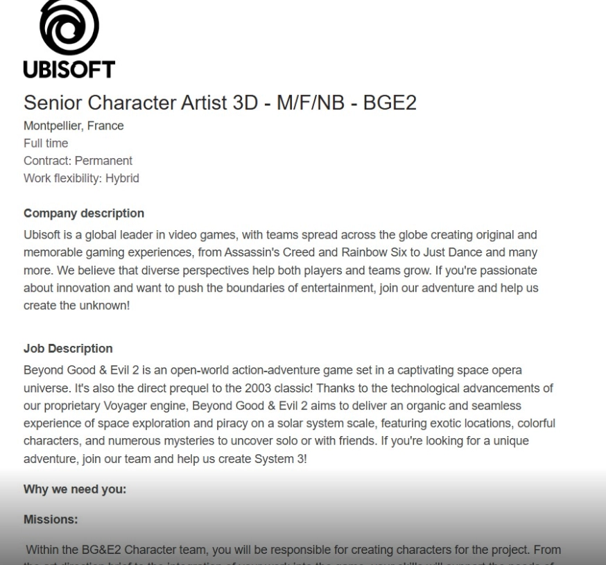 从职位描述来看,角色设计和音频设计工作还没完成,这表明游戏的整体开发进度仍处在中间阶段。在经过多年的延期以及内部方向调整后,《超越善恶2》并没有被取消,不过它的上市时间依然没办法确定。