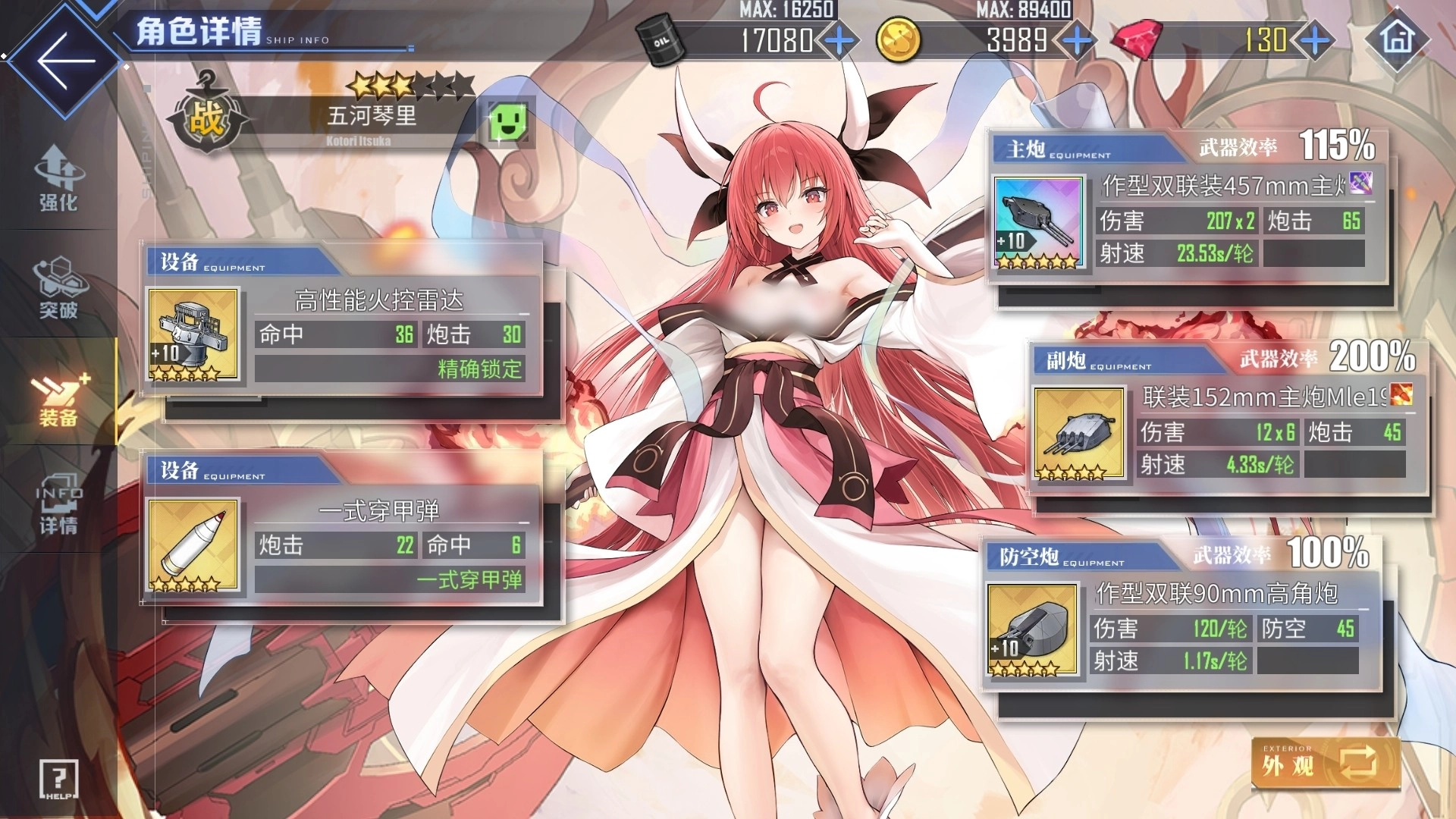 同时,五河琴里的专属兵装灼烂歼鬼可进一步提升她的生存能力——当战斗中她的耐久降至70%以下时,会每5秒为自身恢复2%的耐久。在舰装搭配方面,五河琴里与常规金战列的配装差异不大:有彩炮时优先使用彩炮,若无彩炮则选择欧根炮、弗兰炮或紫MK6;防空炮首选STAAG,副炮搭配任意泛用轻巡炮即可。设备选择上,无调速需求时,金火控搭配白弹是很合适的组合;若有调速需求,则可通过黑弹、弹链等设备进行调速调整。