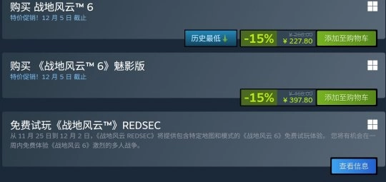 《战地6》PC端Steam版本当前同样处于历史最低价,售价为227.8元。