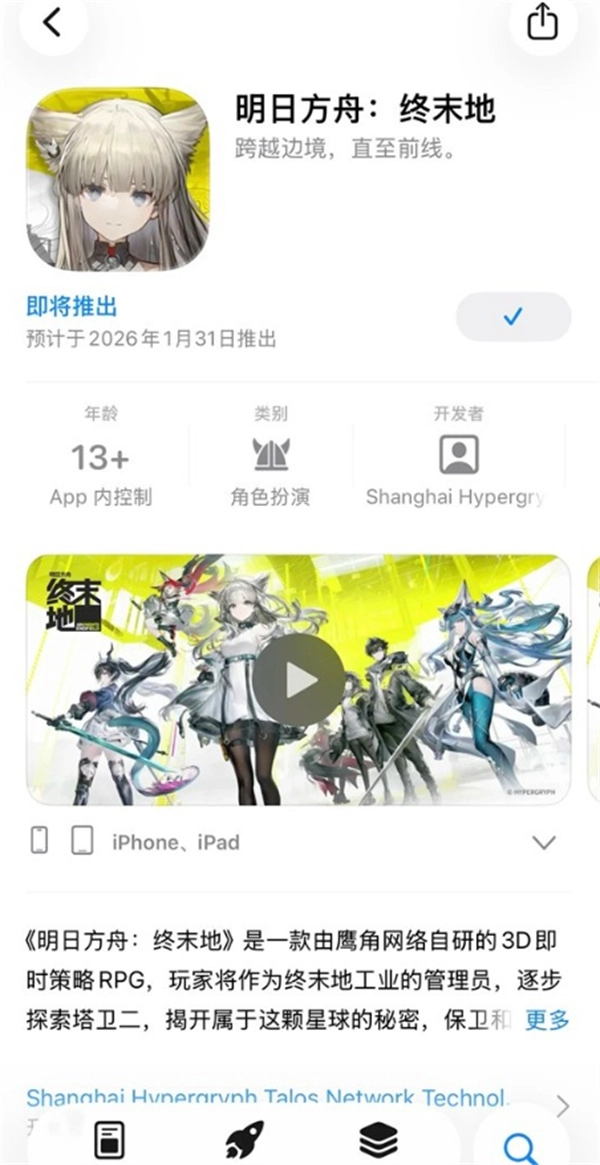 2025年11月28日,《明日方舟:终末地》于App Store启动预约通道,玩家既能通过App Store平台,也可前往游戏官方网站完成提前预约,以便第一时间体验这款广受期待的全新作品。官方同时提示,游戏的具体上线日期将通过后续公告另行通知,还请玩家持续留意官方发布的相关信息。