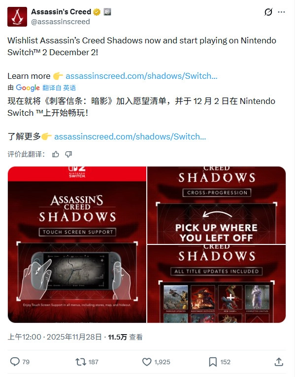 《刺客信条:影》已于今年3月正式推出,登陆了PC、PS5以及Xbox Series X/S平台。而Nintendo Switch 2的移植版本,将囊括游戏发售之后推出的所有更新内容。该游戏支持触屏操作功能,玩家可借助触屏来进行菜单操作、地图导航以及藏身处建造等操作。不仅如此,游戏还支持Ubisoft Connect的跨平台进度同步,使得玩家能够在其他平台上继续推进自己的游戏进度。