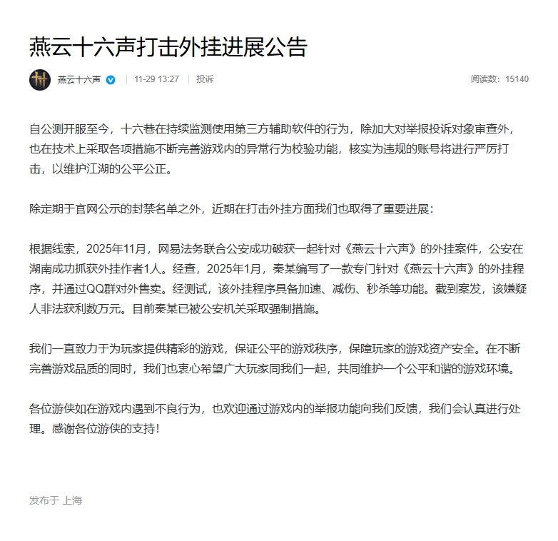 公告显示,依据相关线索,2025年11月期间,网易法务部门协同公安机关,顺利侦破了一起针对游戏《燕云十六声》的外挂案件,公安人员已在湖南地区成功将该外挂的开发作者1名抓获。