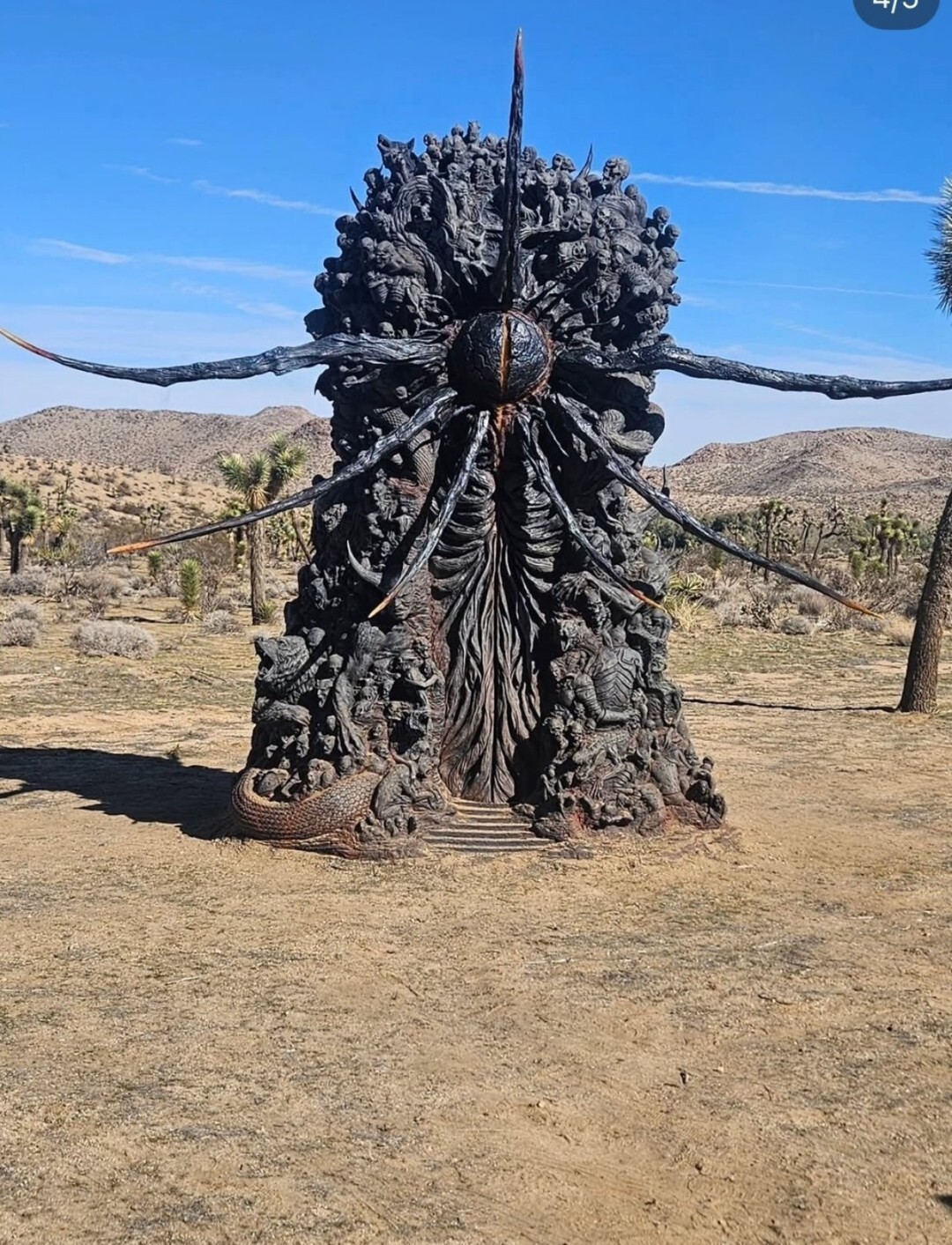 坐标被破译后,一些热心的游戏爱好者马上动身前往该地点实地探索。令人惊讶的是,他们真的在荒凉的沙漠里发现了一座特意安置在这里的奇特金属雕塑。这座雕塑结构复杂,中心部分是一个造型怪异、被部分人称为“太空外星人”的形态;而它整体蜿蜒盘绕的结构,让不少玩家第一时间就联想到了热门游戏《战神》里极具标志性的角色——“世界之蛇”。