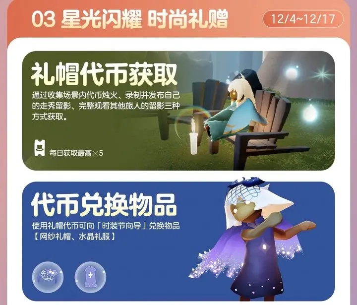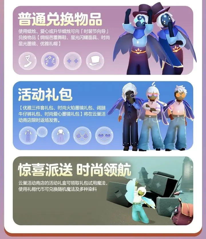光遇2025时尚日活动已确定不会推出新物品,所有活动内容均为去年物品的复刻返场。活动进行期间,玩家能通过挂机的方式收集礼帽代币,用这些代币兑换网纱礼帽和水晶礼服这两件往期物品;与此同时,还可以使用常规蜡烛、爱心等游戏内资源,兑换绸缎芭蕾舞鞋、星光闪耀面具等四款经典装扮。