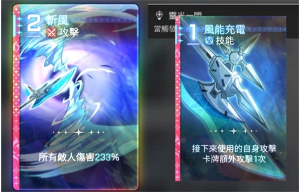 疾风1击(消耗2点费用):能造成单次高额伤害,同时为自身附加护盾效果,该技能可以和风能充电技能搭配使用。