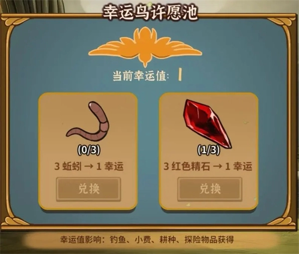 探险中获取的紫色晶石可以在石碑处给队友升级,探险获得的红色晶石和日常行动中获取的蚯蚓可以用来在许愿池处提升人物幸运值