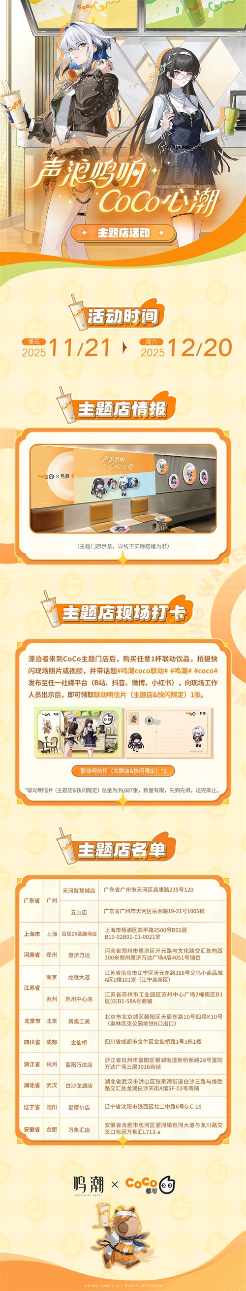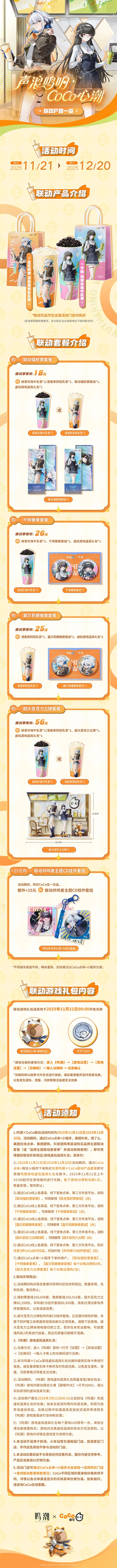 「声浪鸣响,CoCo心潮」鸣潮与CoCo都可官方携手打造的联动活动,将于11月21日正式启动,联动套餐及主题门店也将很快上线。