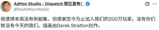 官方称:“尽管本周没有新剧集让我们也觉得遗憾,但我们更要向已经加入我们的200万玩家表达感谢——要是没有你们,也就不会有我们。”