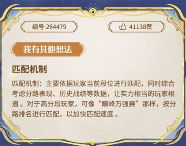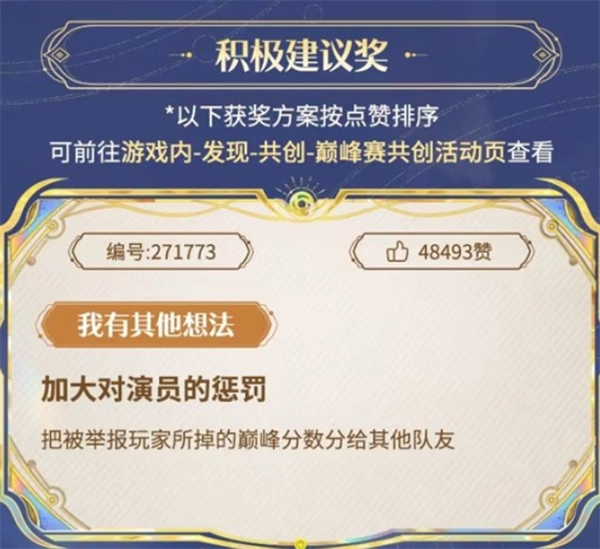 除了总榜设想,玩家还针对匹配时长、巅峰万强赛、榜单含金量、荣誉奖励以及违规行为监控等方面提出了多元化优化建议。官方根据方案点赞和社区讨论情况,从入围方案中综合选取了十个获得“积极建议奖”的方案。