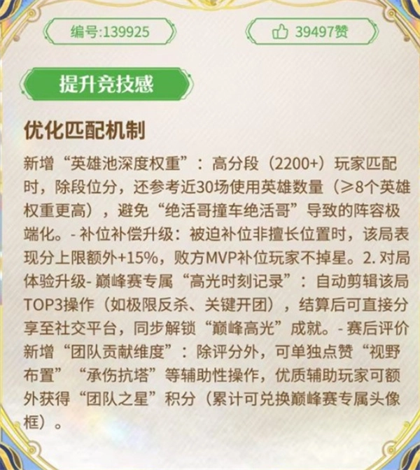 匹配优化:结合段位、分路表现与历史战绩进行综合匹配,此外还新增了“英雄池深度权重”机制,并对补位补偿规则进行了升级。