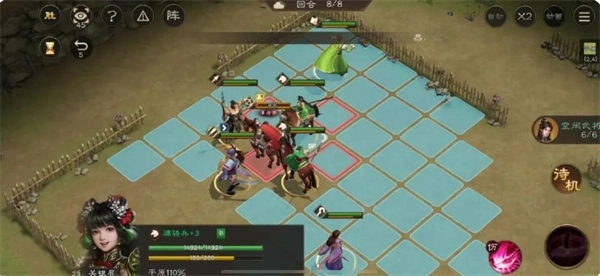 第一回合操作如下:给曹操增加攻击力,全体成员往回移动,对2个骑兵展开攻击。同时,安排一人进行走位,将徐晃引诱至浅滩位置,并且要让此人占据火药桶旁边。