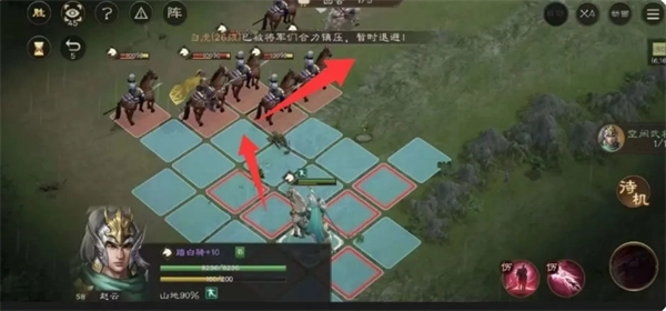 过关的条件是让公孙瓒跑到上方,在此需要简要熟悉赵云的技能。走位使用一技能穿过骑兵,然后挡在前方,让公孙瓒自行逃离,下一回合再挡一次,很简单。