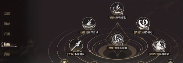 被动技能:无鸣挽歌。当角色上场时,若场上同时存在原调音域或离调音域,便可触发余音扩散效果,对处于该音域内的敌人造成伤害。无论触发的是原调音域还是离调音域,均能造成53.35%的连携伤害。