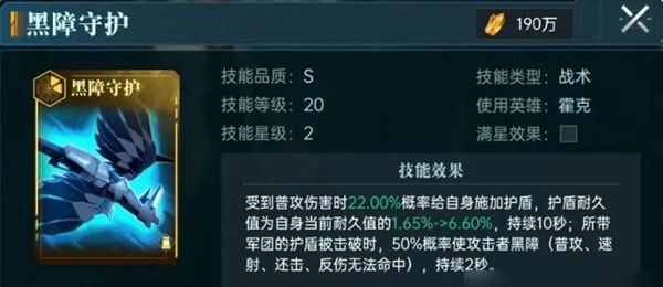 后续在操作时,可借助护盾最大耐久的百分比对敌人造成伤害。即便该角色未升阶,其技能依旧十分强大,能基于最大耐久值造成40%的伤害。此外,霍克的“黑翼守护”技能,不仅能为自身增添护盾,还有50%的几率使敌人陷入黑障状态,让对方所有攻击都无法命中。再搭配活性盾技能,可助力自己更稳定地生成护盾。