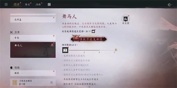 开启试炼,选择角色鬼神愁舞马人,装备武器九重春色与无名剑法。
