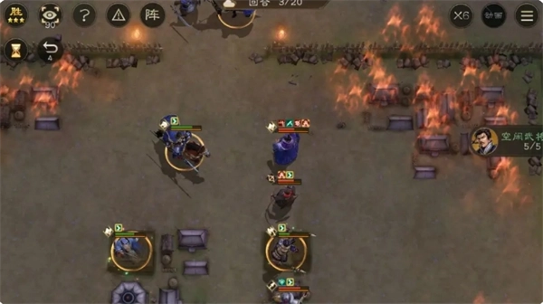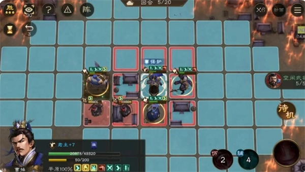 第一回合,曹操朝着上方对右边的弓兵攻击一下,荀彧使用一技能,与典韦的一技能相配合,成功击杀胡车儿。与此同时,夏侯使用一技能将小兵消灭,而许褚则向下移动一格,对右边的小兵发起一次攻击。