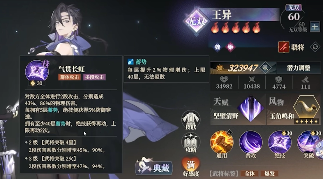 王异的招牌绝技“气贯长虹”,堪称极具表现力的一项技能。此技能会对敌方全体施以致命的两段伤害。更为关键的是,随着蓄势层数的逐步累积,每当达到特定层数时,该技能便会附带防御穿透效果。这意味着,王异不仅具备出色的伤害输出能力,还能有效削弱敌方的防御,从而极大地提升了她在战场上的威胁程度,令敌人胆寒。一旦王异成功达到指定的蓄势层数,“气贯长虹”技能还将触发再次行动的宝贵机会,这无疑为她迅速压制敌方、扭转战局提供了有力保障,使其在战场上的作用愈发关键。