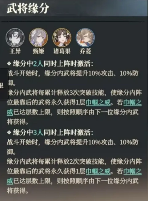 从缘分角度而言,王异与甄姬、诸葛果以及乔菱存在特殊关联。借由提升缘分内武将的防御与攻击,她能够助力这些武将在战斗中更出色地施展本领,尤其是在突破技的战意消耗方面,还可进一步强化队伍的综合作战能力。