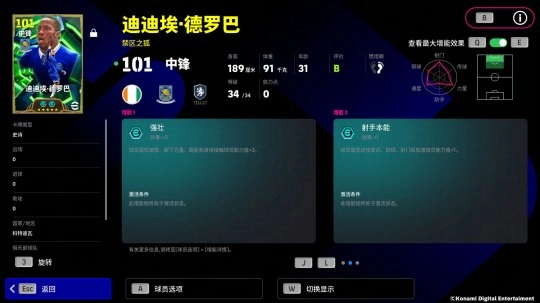 德罗巴的增能属性是【强壮 +3】,速度与身体接触的提升,让他那如同合金浇筑的身躯在进攻途中能碾压所有阻碍!凭借【无定型射门】这一特殊技巧,即便背对球门,他也能在转瞬之间拧身完成爆射破门!此外他还自带【到位传球】的特殊技巧,总能送出手术刀般精准的传球,为队友创造得分良机!