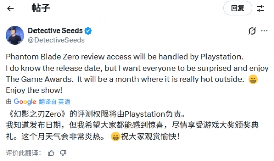 《影之刃零》的评测权限安排将由PlayStation负责。发售日期我其实是知道的,但我更希望大家能在TGA上收获惊喜、享受当下的时刻。另外可以透露的是,游戏会在天气十分炎热的某个月份推出。祝各位观览顺利、心情愉悦!