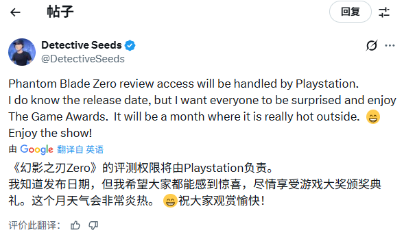 《影之刃零》的评测权限将由PlayStation负责统筹安排。我确实知晓游戏的发售日期,但更希望大家能在TGA上收获惊喜,尽情享受那一刻的期待感。发售时间会选在一个天气十分炎热的月份。祝愿大家届时观赏愉快!