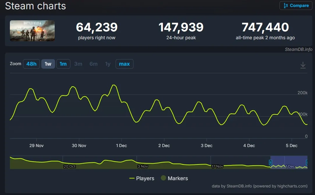 在《战地6》正式推出前的几个月里,市场对这款射击游戏的期待值曾攀升至前所未有的水平,业内不少声音都认为今年或许会成为“战地之年”。游戏上线初期的表现确实亮眼,一度创下约75万玩家同时在线的纪录,这一数据超过了历代《使命召唤》系列的首发同期成绩。