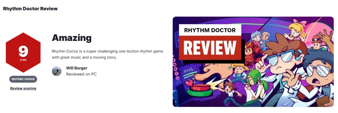 外媒IGN给出9分好评,称这款游戏是极具挑战性的单按键节奏游戏,不仅音乐出色,故事也十分动人。