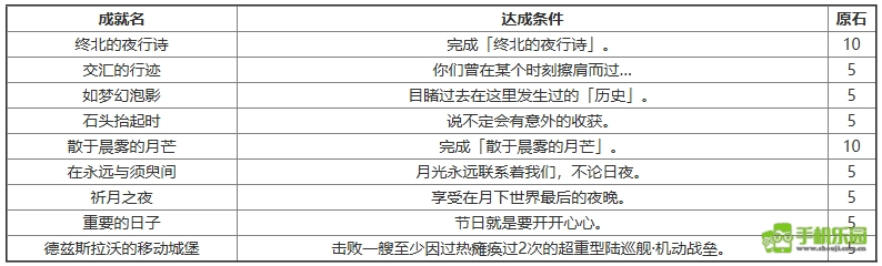 其中涵盖完成剧情任务「终北的夜行诗」与「散于晨雾的月芒」,触发像「石头抬起时」这类特定场景互动,还有参与战斗挑战「德兹斯拉沃的移动城堡」等内容。